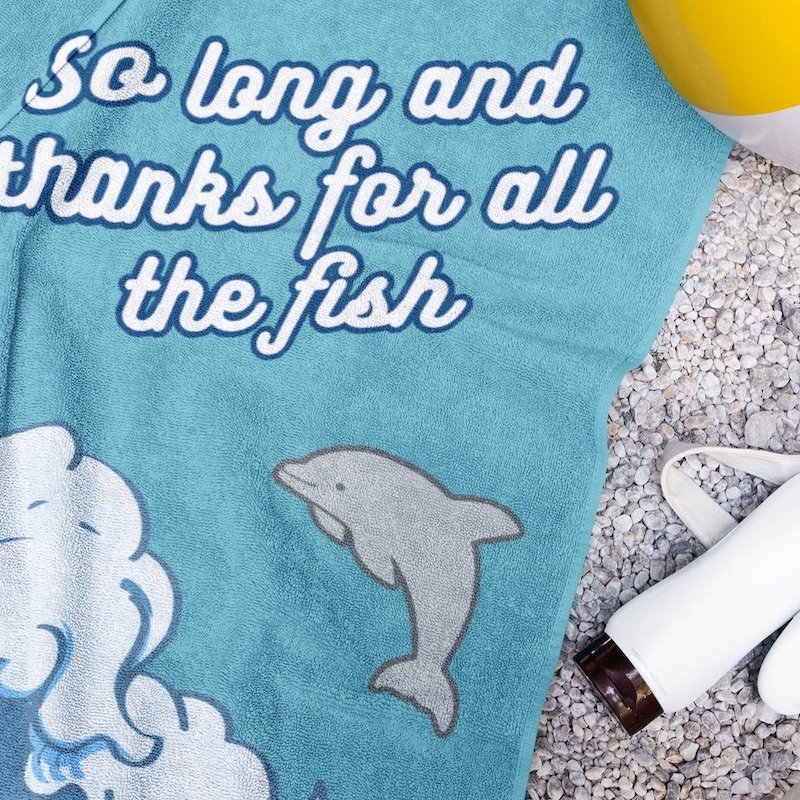 This So Long And Thanks For All The Fish towel is our ode to the fourth book in the Hitchhiker’s Guide to the Galaxy… Thanks for saving us, dolphins!